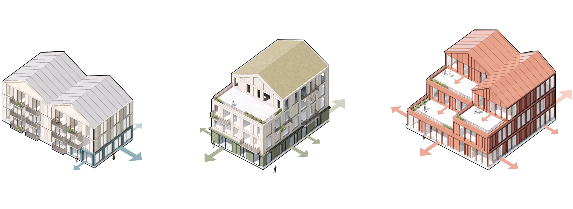 The total of 160 housing units includes care homes, dementia care homes, senior collective housing, and mixed family and youth housing. All residential buildings are designed with a residential identity while the common areas and functionalities are differentiated and adapted to various needs. The goal is to avoid a stigmatizing environment. The neighborhood also includes facilities for physical activity, a health center, a community house, as well as plenty of green areas.