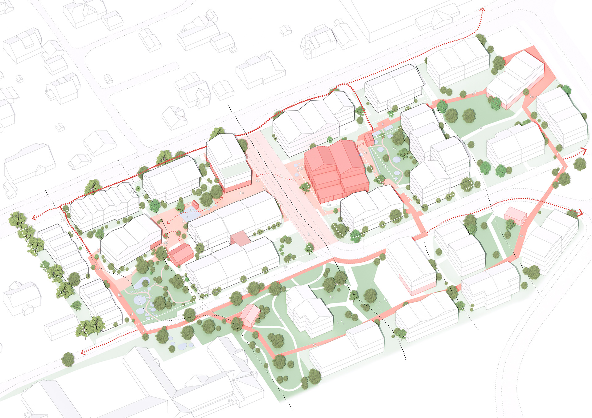 Runnivegen Health Community is an innovative strategic urban development and master plan, designed to create a diverse and health-centered living environment. The new neighborhood addresses several present challenges, including demographic changes, shifts in the health sector, and evolving care needs in the coming years.